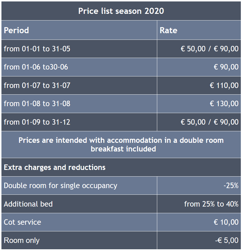 Rates include: continental breakfast, daily room cleaning service, bed linen changed every four days, towels changed on request, use of the kitchen for preparing children’s meals, use the barbecue in the garden, free use of bicycles.