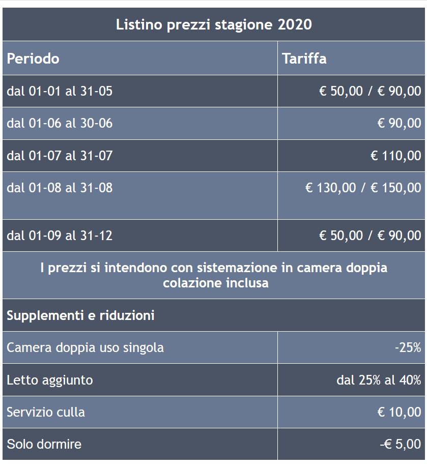 Le tariffe comprendono: colazione continentale, pulizia giornaliera delle camere, cambio biancheria ogni quattro giorni, cambio asciugamani quando richiesto, uso della cucina per i bambini, uso del barbecue in giardino, servizio biciclette, parcheggio privato interno alla villa.